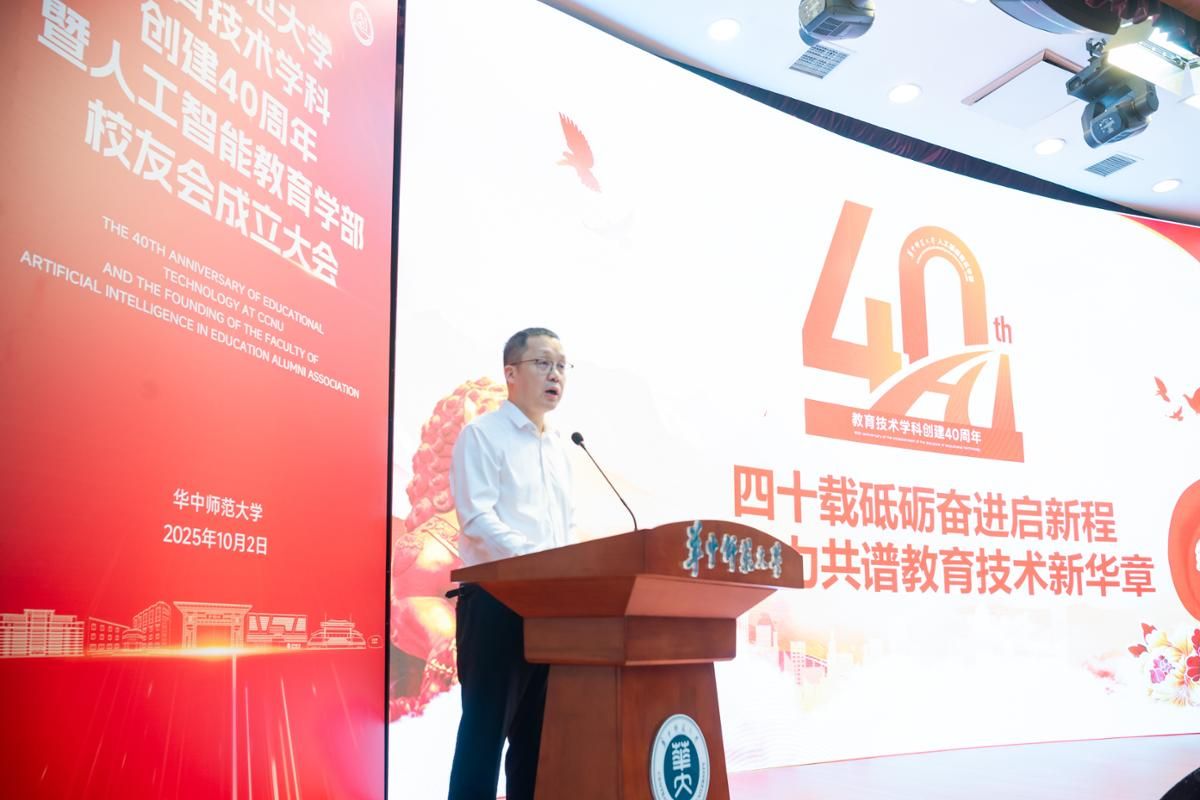 On October 2, 2025, the ceremony marking the 40th anniversary of the establishment of the Educational Technology discipline and the inauguration of the Alumni Association of the Faculty of Artificial Intelligence in Education was held at the Science Auditorium of CCNU. The event was attended by the following individuals (listed in no particular order): Shuangjie Peng, President of CCNU; Zongkai Yang, Director of the National Engineering Research Center for E-Learning (NERCEL) and the National Engineering Research Center for Educational Big Data (NERC-EBD), and Senior Professor of CCNU; Daolin Zha, Deputy Secretary of CCNU Party Committee; Two Vice Presidents of CCNU, Hongda Liu and Sannyuya Liu; Zhiting Zhu, the Tenured Professor of East China Normal University; Jiyou Jia, Director of the Department of Educational Technology in the School of Education at Peking University and Director of the International Research Center for Educational Informatization; as well as representatives from various university departments, schools (faculties), faculty members, students, and alumni of the Faculty of Artificial Intelligence in Education.